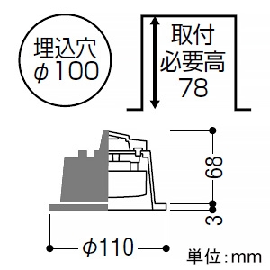 ●サイズ(mm):幅 φ110、出幅 3、埋込高 68、取付必要高 78