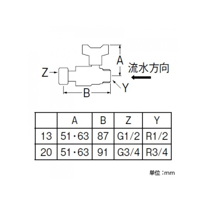 ●寸法(mm):A-51(アダプター取付時-63)、B-91、Z-G3/4、Y-R3/4