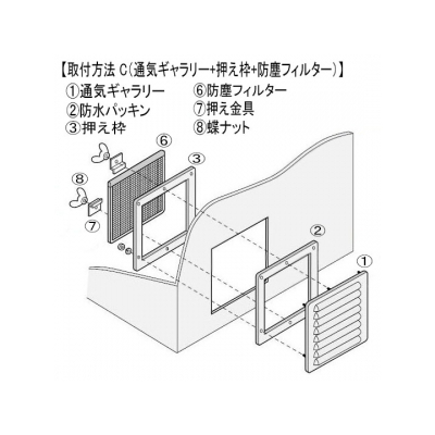 ●セット内容:通気ギャラリー(G1-15S/SUS製)、防水パッキン(G-PS15)、押え枠(G15S-WS/SUS製)、防塵フィルター(G15-FD)、押え金具、蝶ナット