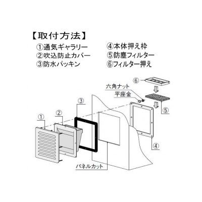 ●セット内容:通気ギャラリー、吹込防止カバー、本体押え枠、防水パッキン、防塵フィルター、フィルター押え