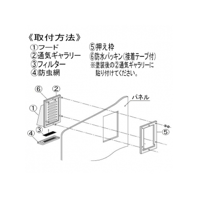 ●セット内容:フード、通気ギャラリー、フィルター、防虫網、押え枠、防水パッキン(接着テープ付)