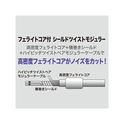 ●ノイズに強いシールド付きツイストモジュラーケーブルに一体成形の高密度フェライトコアを取り付けており、ADSL・高速通信に最適です。